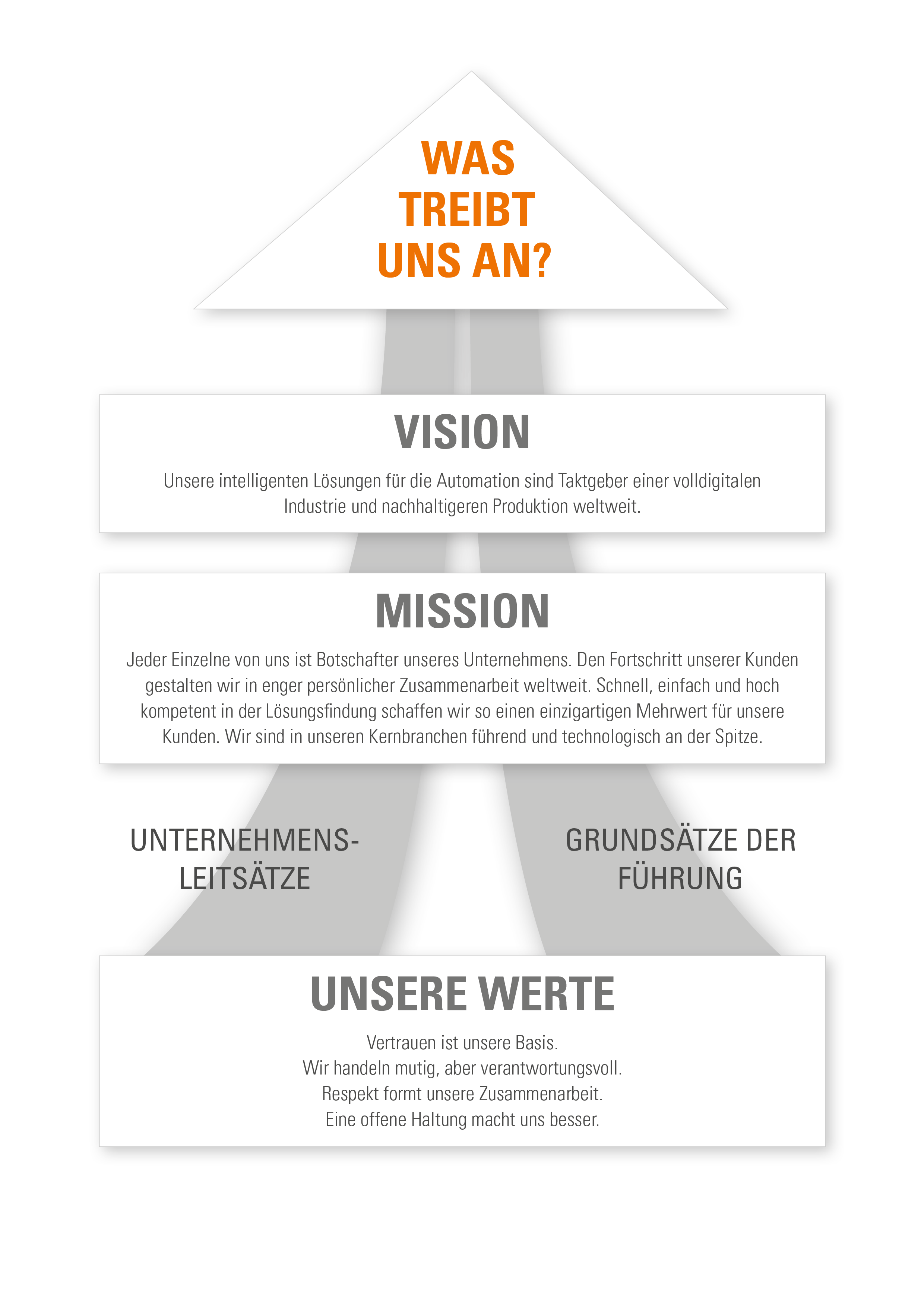Wir denken voraus und definieren den Status quo neu. Wir entwickeln Mehrwerte aus Technologien, Kundennähe und Kundenservice, um besser zu sein als marktgängige Standards. Kunden sollen uns immer stärker über Innovation und damit verbundene technologische Alleinstellungsmerkmale unserer Produkte und Services wahrnehmen. Wir wollen Sie mit unserem ausgeprägten Anwendungsverständnis und einem schnellen, unkomplizierten Service überzeugen. Unsere Zusammenarbeit ist geprägt von Freundlichkeit, Klarheit und Ehrlichkeit. Jeden Tag entwickeln wir als Team mit viel Leidenschaft unser Familienunternehmen gemeinsam ein Stück weiter: lean, nachhaltig, digital und robust. Jeder bei uns soll dabei Freude und Stolz empfinden.
