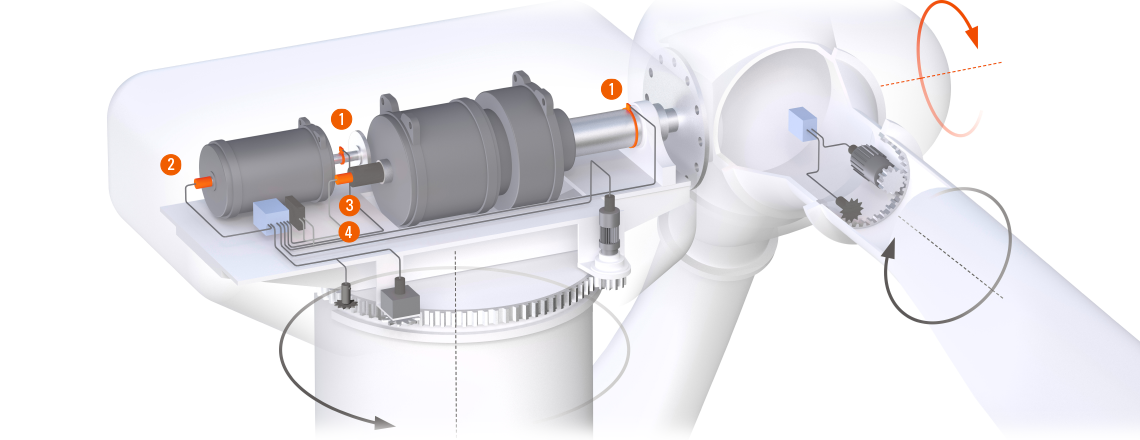 Accurate position and speed information are important measured variables for the control loop of a wind turbine. Kübler offers the right sensor solutions for this purpose: from extremely robust encoders for monitoring the generator speed at the shaft end, to compact encoders for integration in the slip ring, to bearingless encoders for direct speed detection at the rotor and generator shaft.