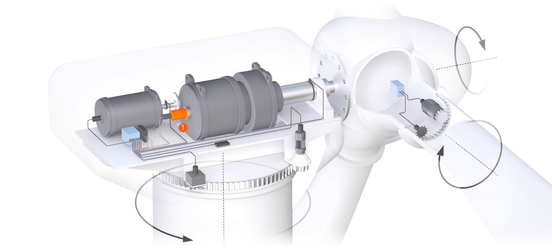 En plus du grand nombre de capteurs pour la surveillance, le positionnement et pour la mesure de la vitesse de rotation, on utilise également des collecteurs tournants pour la transmission de puissances, de signaux et de données. Les collecteurs tournants de Kübler conviennent pour tous les types d'installation avec un contrôle pitch hydraulique ou électrique. Ils permettent une alimentation fiable des entraînements de la régulation des pales du rotor et une transmission impeccable des données des différents capteurs au sein des éoliennes. Les données par bus de terrain et Ethernet sont également transmises de manière fluide via le collecteur tournant. Grâce à nos compétences dans le domaine des capteurs, nous vous offrons des solutions globales : Collecteur tournant avec codeur intégré pour une transmission et une mesure de la position fiables. Pour vous, nous complétons notre offre en techniques de la transmission avec les câbles et connecteurs adaptés et de haute qualité pour nos codeurs. De plus sont également à votre disposition des systèmes à fibre optique pour une transmission fluide des données.